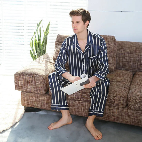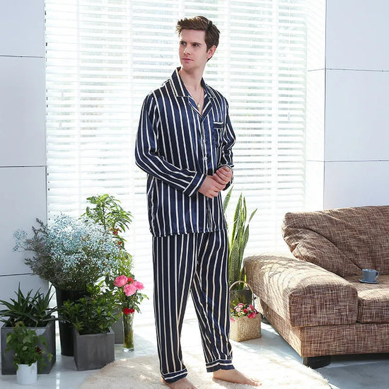 A luxurious two-piece pajama set crafted from simulated silk fabric, featuring elegant stripe patterns. Designed for ultimate comfort and style during the fall season.