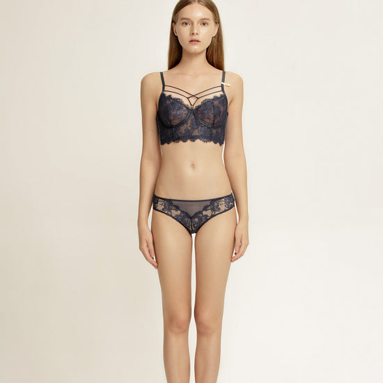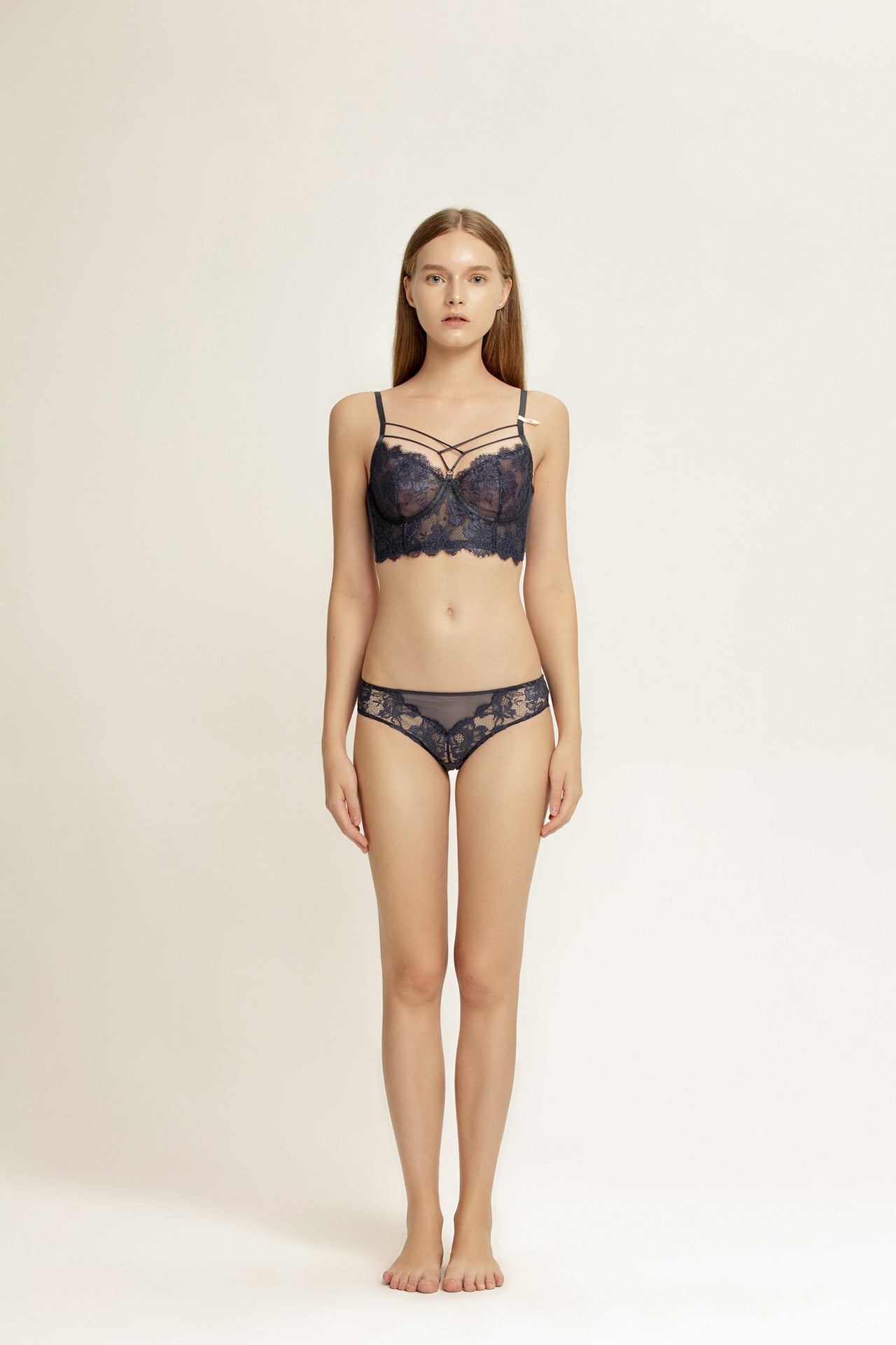 Design: Bra with gathered front for enhanced shape, paired with matching lace panties