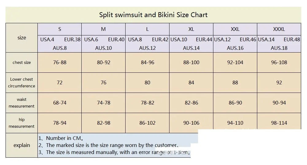 Swimwear Size Chart (S, M, L, XL, 2XL, 3XL)