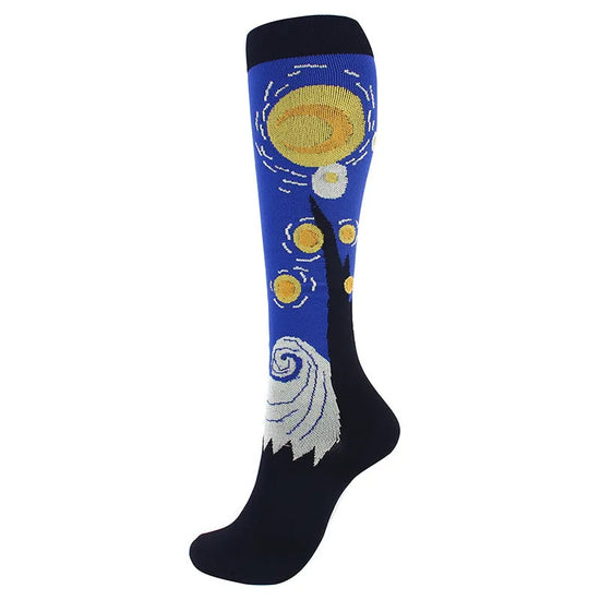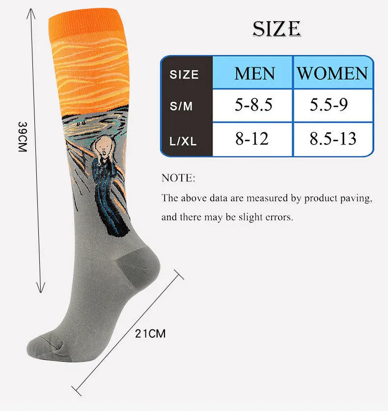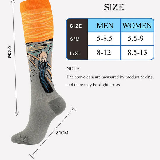 Step up your game with our Running Compression Socks, uniquely adorned with famous painting patterns. These knee-high socks are designed to provide optimal compression, enhancing blood circulation and reducing muscle fatigue during your runs. The vibrant artwork adds a touch of personality to your athletic wear, making them as stylish as they are functional.
