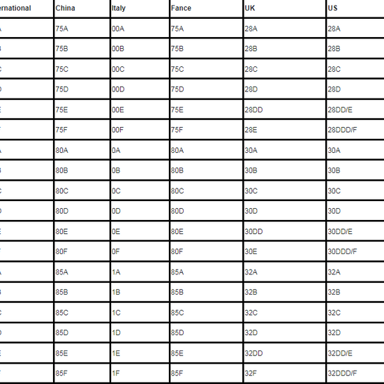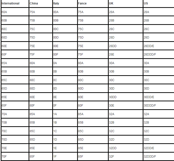 Bra Size Chart (S, M, L, XL, 2XL, 3XL)
