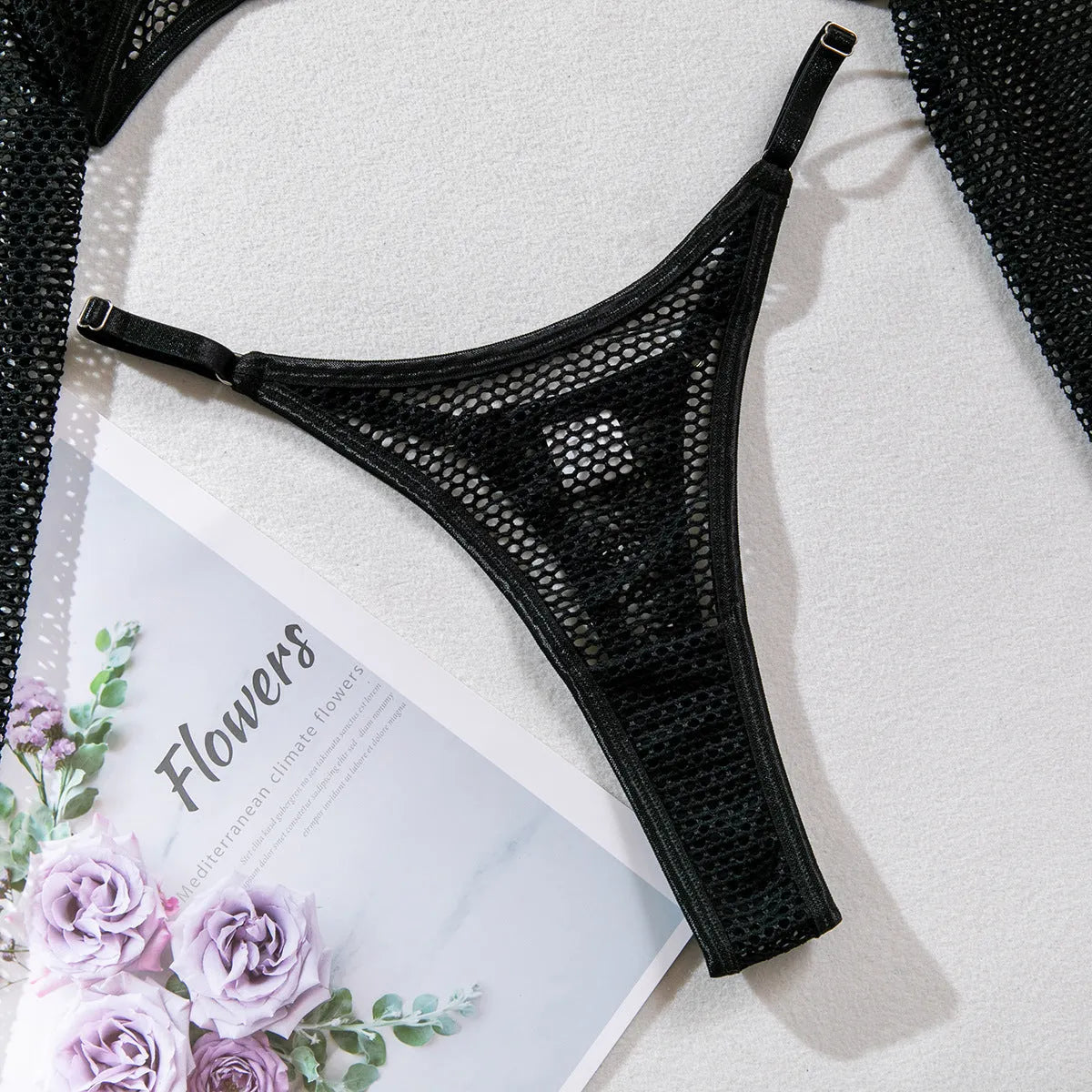 A daring and stylish three-piece ensemble featuring a T-back bra, ultra-short waistcoat, and matching bottoms. Designed to make a bold fashion statement with its contemporary cut and edgy design.
